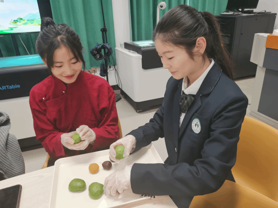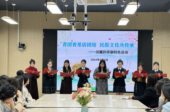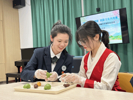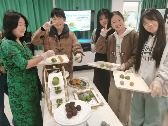 身穿民族服装的藏族同学与汉族伙伴欢聚一堂,她们用糯米粉和青草汁揉制面团,包裹豆沙、咸蛋黄等馅料,通过搓、压、揉、团一系列动作,齐心协力制作出色泽碧绿、香甜软糯的青团,整个制作过程让大家感受到了中国饮食文化的精妙。为深入了解传统民俗,同学们还介绍了清明节的起源、风俗、传说及饮食,并表演了精彩的诗朗诵《拥抱春天》。活动现场弥漫着艾草的清香和糯米粉的甜味,汉藏小伙伴们有说有笑,互相点赞,呈现出温馨雅致的氛围,充满了浓浓的文化气息。小小的青团包裹住了春天,也增进了伙伴们之间的友谊,拉近了汉藏之间的情感距离。