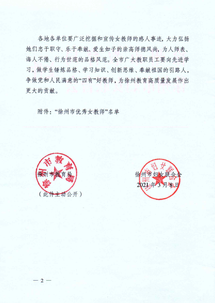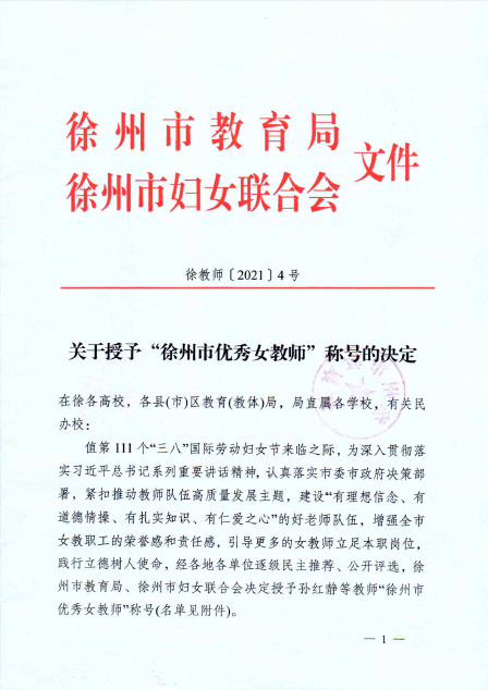 近日,徐州市教育局、徐州市妇女联合会下文《关于授予“徐州市优秀女教师”称号的决定》(徐教师【2021】4号),VSport体育辅导员李媛荣获“徐州市优秀女教师”称号。