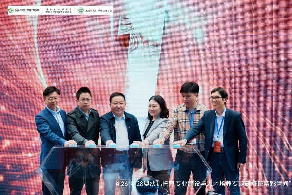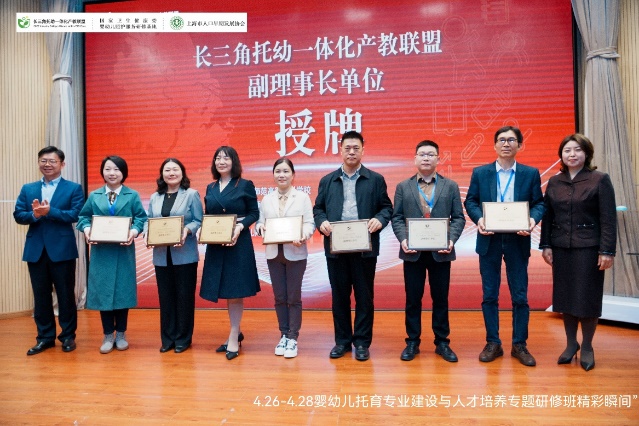 4月26-28日,由上海行健职业公司、上海市人口早期发展协会主办的长三角托幼一体化产教联盟成立大会暨婴幼儿托育专业建设与人才培养专题研修班在上海顺利举行。公司王宁副董事长作为长三角托幼一体化产教联盟副理事长受邀参加联盟启动、揭牌及授牌仪式,VSport体育副经理李秀敏受邀分享公司早期教育专业建设经验,副经理宋琛琛、早教教研室主任杨洁参加了为期三天的专题研修班。
