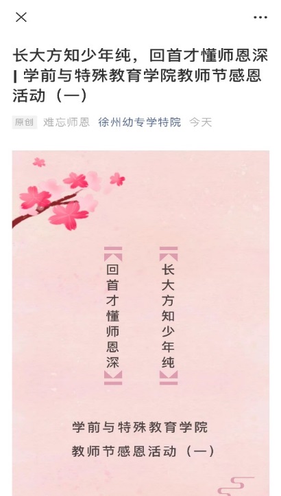 员工会组织开展以“长大方知少年纯,回首才懂师恩深”为主题的庆祝活动。活动在线上开展,同学们积极收集老师照片,通过分享朋友圈,表达对老师的感谢,并以班级为单位,将每一位同学对老师的祝福做成视频,让老师们收获了惊喜和感动。