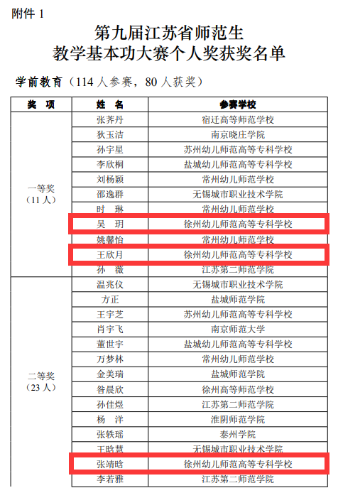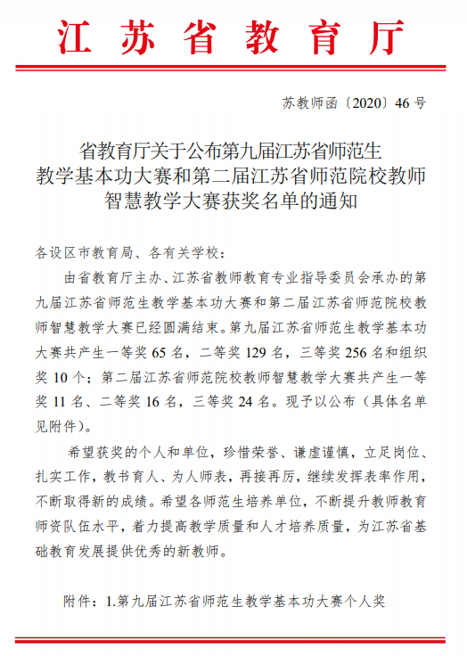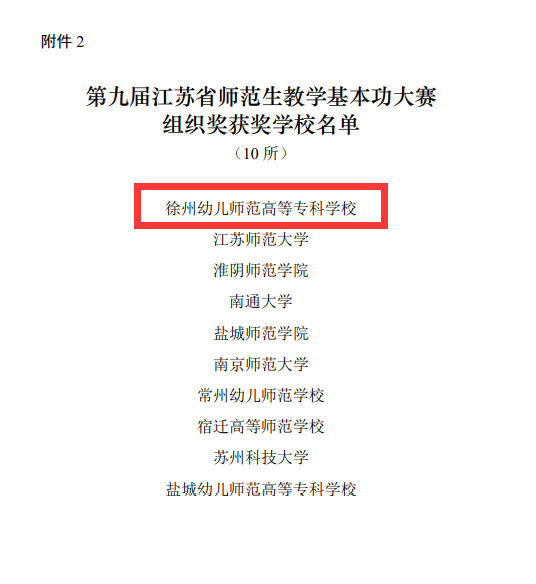 第九届江苏省师范生教学基本功大赛(学前教育组)于2020年11月6日-8日在公司举行,全省共有31所院校114名选手参赛。近日,获奖结果揭晓,公司选派的五名选手稳定发挥,全部获奖。其中,吴玥、王欣月获一等奖,张靖晗获二等奖,孔祺、王亭亭获得三等奖。公司获优秀组织奖。