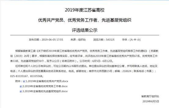 近日,江苏省教育厅组织处发布2019年度江苏省高校优秀共产党员、优秀党务工作者、先进基层党组织评选结果,公司公司党总支荣获江苏省高校先进基层党组织称号。