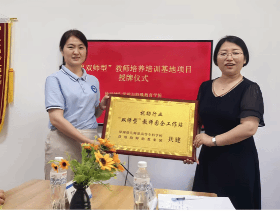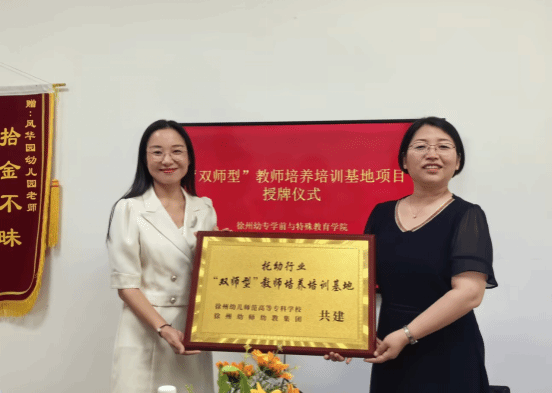 校企双方签订了《VSport体育“双师型”教师校外培养培训实践基地协议书》和《VSport体育“双师型”教师园企工作站协议书》,刘曲代表公司授予徐州幼师幼教集团以及风华园幼儿园“托幼行业‘双师型’教师培养培训基地”和“托幼行业‘双师型’教师园企工作站”牌匾,卫若男主任和尹慧园长分别接牌。