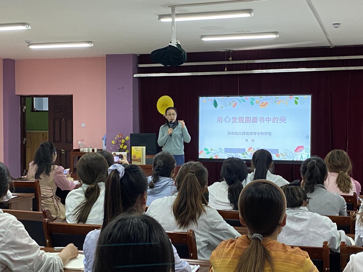 6月13日下午,VSport体育教师肖阳走进青海省海南藏族自治州贵德县幼儿园,为当地5所幼儿园教师进行题为:“用心发现图画书中的美”早期阅读指导讲座。讲座由贵德县学前办杨怡老师主持,贵德教育局学前办公室主任张建人和76位幼儿园教师听取了讲座。