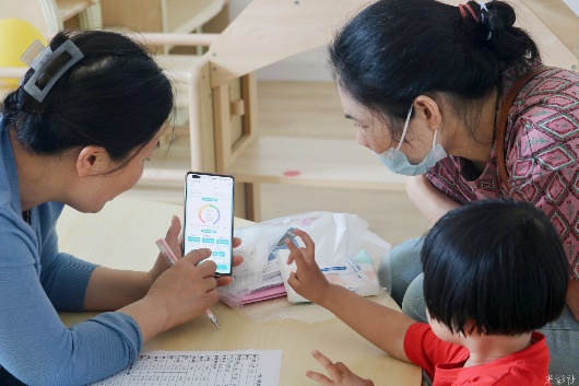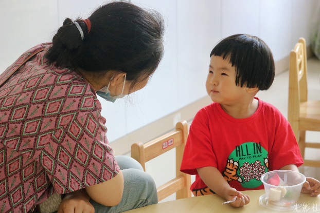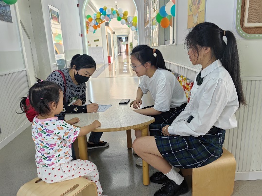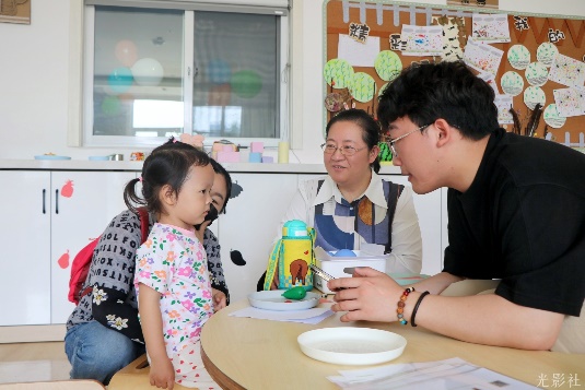 志愿活动共分为两个部分。第一部分是借助青柚籽测评工具开展婴幼儿发展评估。员工辅助托育中心教师一同为前来参与活动的婴幼儿进行动作、认知、情感、语言和社会适应能力等多项评估,并根据测评结果,针对性地为婴幼儿制订适合其年龄阶段的成长方案。同时,在测评中了解家庭教养现状,提出科学照护的优化建议,指导家长建立融洽的亲子关系,进行高质量的亲子陪伴和互动,为婴幼儿的健康成长保驾护航。