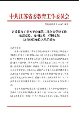 近日,中共江苏省委教育工作委员会发布了《省委教育工委关于公布第二批全省党建工作示范高校、标杆院系、样板支部培育建设单位名单的通知》(苏委教组函(2024)19号),公司党总支第二支部经过层层遴选,入选全省党建工作样板支部培育创建单位。公司历来高度重视党建对公司发展的引领作用,二支部的入选是对公司党建与专业建设融合的肯定,也是全体党员躬耕教坛、立德树人、共同奋斗的结果。