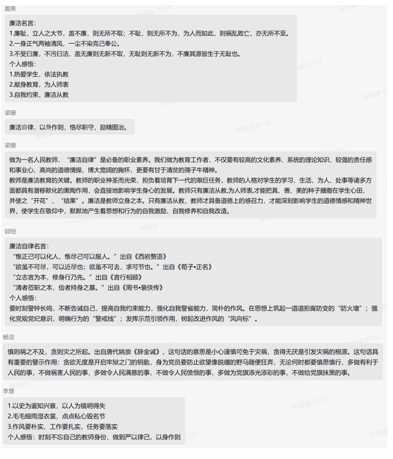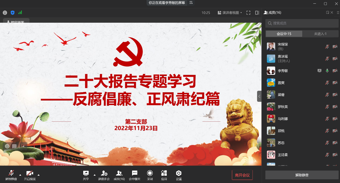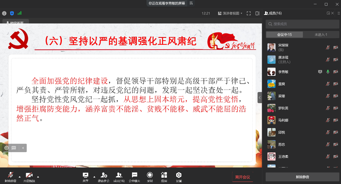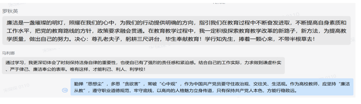 专题学习之后,大家感触良多,纷纷通过企业微信,分享了一些关于廉洁自律的诗句、格言、习语等。同时,大家打开摄像头,在组织委员唐冰瑶老师的带领下线上集体宣誓《新时代高校教师职业行为十项准则》,再次深刻领会师德内涵,这是对自身师德师风建设做出了最大的承诺。