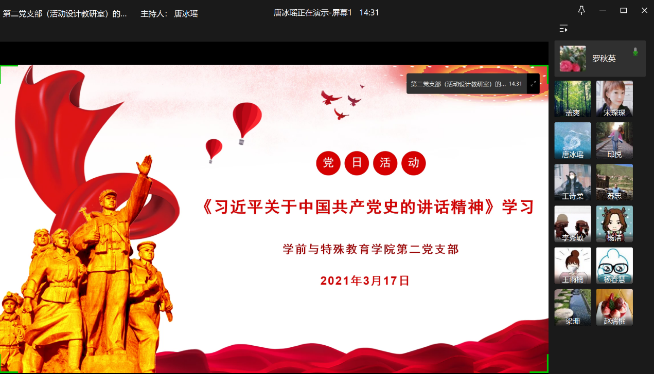 2021年3月17日下午,公司党总支第二支部通过线上会议开展党史学习教育的系列活动。本月主题为“习近平关于中国共产党党史的系列讲话精神”,共同学习习近平总书记在2021年2月-3月之间在各大会议上发表重要讲话中提到的关于党史学习的重要指示和精神。