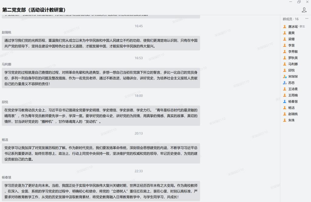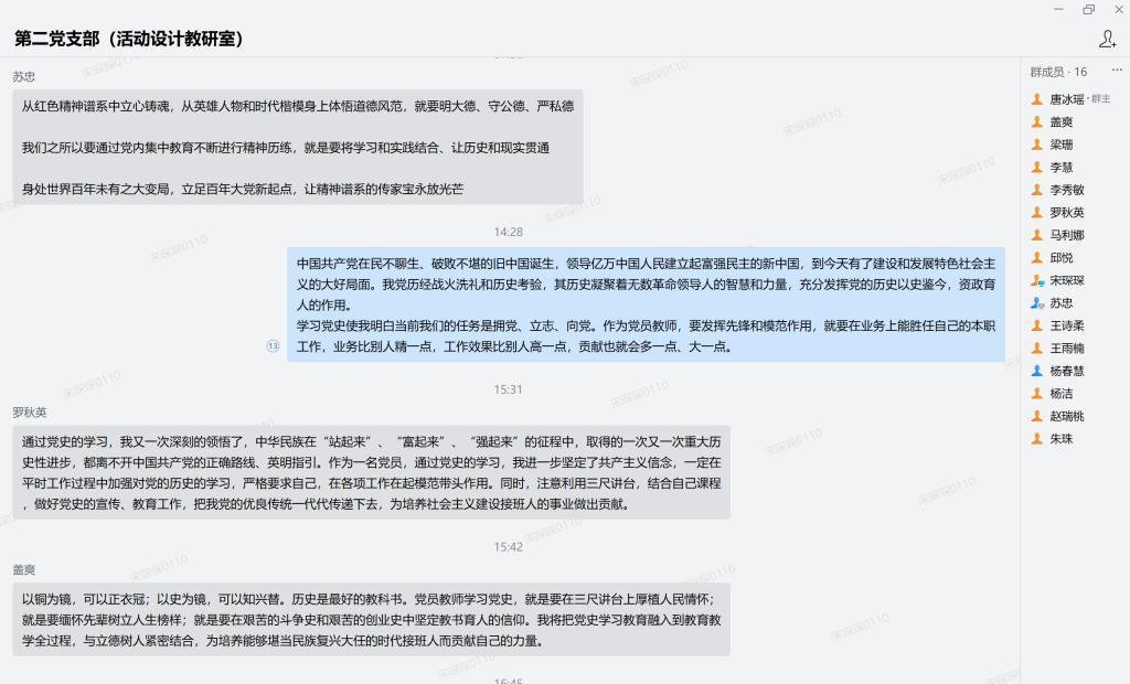 首先,支部党员采用分段领读的方式,逐一带领大家认真学习与领悟习总书记的讲话精神。随后,大家借助企业微信,线上发表了学习感言,讨论十分精彩热烈。最后,支部书记苏忠提出学习要求,希望支部党员老师把党史学习做实抓牢,将其融入到公司产品全过程,与立德树人紧密结合,在各项工作在起模范带头作用。