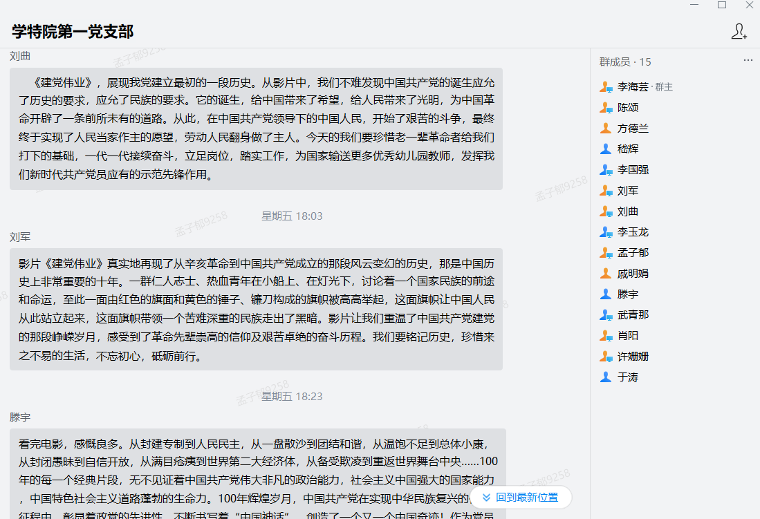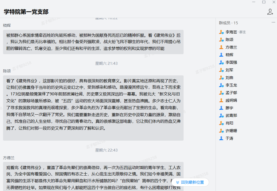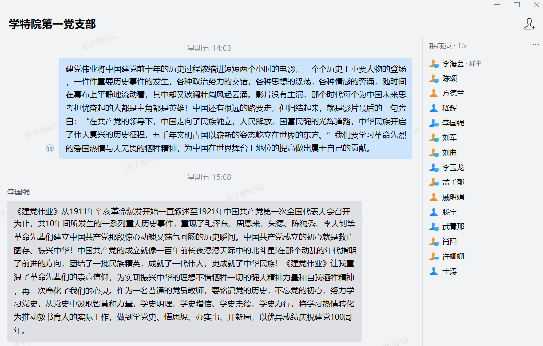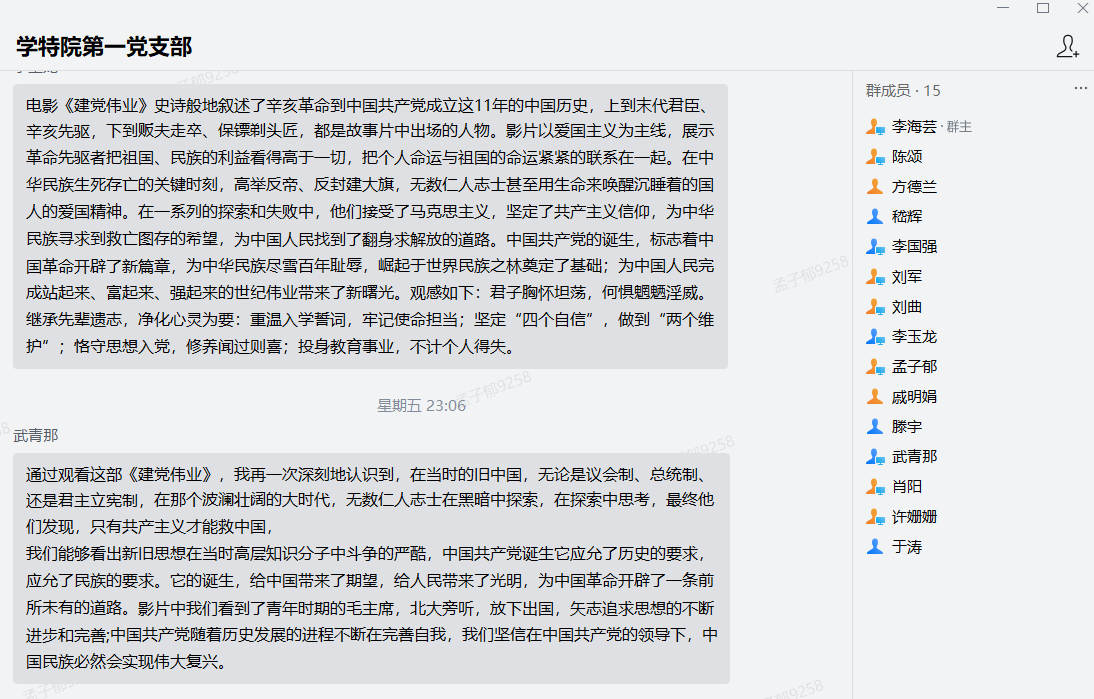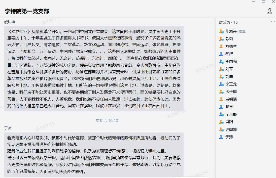 为隆重纪念中国共产党建党100周年,弘扬革命传统、缅怀革命先烈丰功伟绩,3月23日,学特院第一党支部组织全体党员同志开展线上观影活动,共同观看“建国三部曲”系列电影之三《建党伟业》,感受激荡年代中热血青年甘愿抛头颅洒热血的革命精神,缅怀英烈。