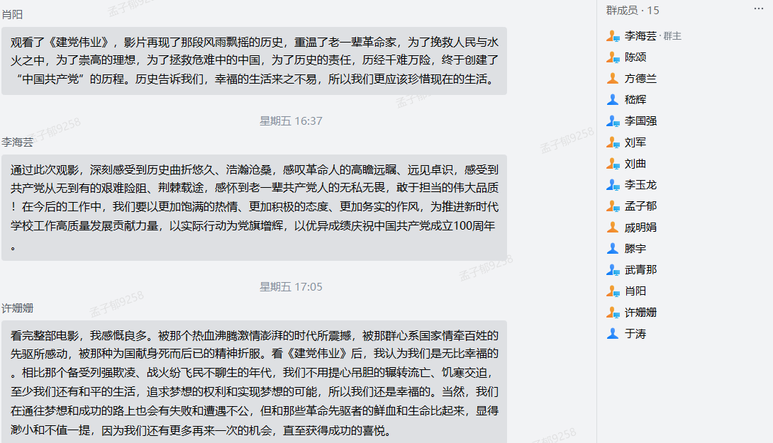 本次观影活动作为党史学习教育的重要学习内容,提醒了全体党员同志要守住共产党人的初心、坚定共产党人的理想信念。观影结束后,全体党员同志一致表示,从电影中再一次深刻认识了中国共产党人的初心和使命。作为新时代的教师党员,要肩负起时代赋予的使命,忠诚于党、听党号令,将爱国、爱党的热情转化为实际行动,以高度的凝聚力、责任心投入到教育工作中去。