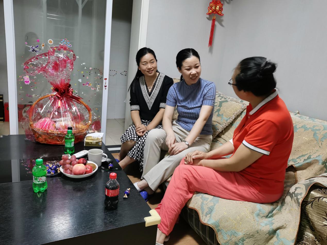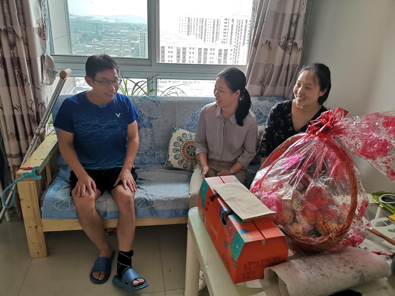党员教师嵇辉因为脚部受伤,在家休养,虽然有病在身,却从未间断教学工作,一直坚持线上教学,没有耽误员工一节课。李海芸、刘念、盖爽来到嵇辉家中,送上组织的关怀,鼓励嵇老师积极治疗,好好养病,早日康复。
