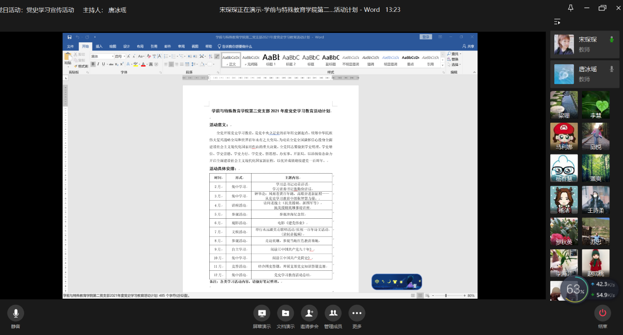 二支部2021年度的党日活动将围绕“以史为鉴 以学为基 向史而新”党史学习教育活动的主题有序推进。本次党日活动分为三个部分,支部组织委员唐冰瑶老师主持。第一部分由李海芸书记发布党史学习教育活动动员讲话。李书记首先肯定本次党日活动内容选择体现了二支部支委们理论学习的领先意识,紧接着对习近平总书记2月20日出席党中央党史学习教育动员大会的重要讲话精神进行宣讲,带领党员教师们回顾党的十八大以来5次党内集中教育活动的主题,并再次强调2021年党史教育恰逢建党百年的重大时刻,“两个一百年”历史交汇的关键节点,具有十分深远的意义。第二部分支部书记苏忠教授从用四句经典话语“历史就是我们的一切”(恩格斯),“我们要认真回顾走过的路,不能忘记来时的路,继续走好前行的路。”(习近平),“在动荡不定的当今世界,唯有历史能使我们面对生活而不胆战心惊”(法国历史学家费弗尔),不要怕、埋头干、跟着走(金一南巜苦难辉煌》)中,帮助党员老师明确党史学习活动的重要意义与目的,从党史学习中重温百年奋斗恢弘史诗,传承党日教育优良传统,接续谱写新的历史篇章。第三部分支部宣传委员宋琛琛老师宣布2021年度支部党日活动的计划,本年度活动将充分利用集中学习、自主学习、党课讲座、参观活动、观影活动、党史知识竞答等多种形式,充分组织支部党员教师加强党性修养,发扬革命传统,勇担历史重任,践行时代使命,推动本职工作上新台阶。