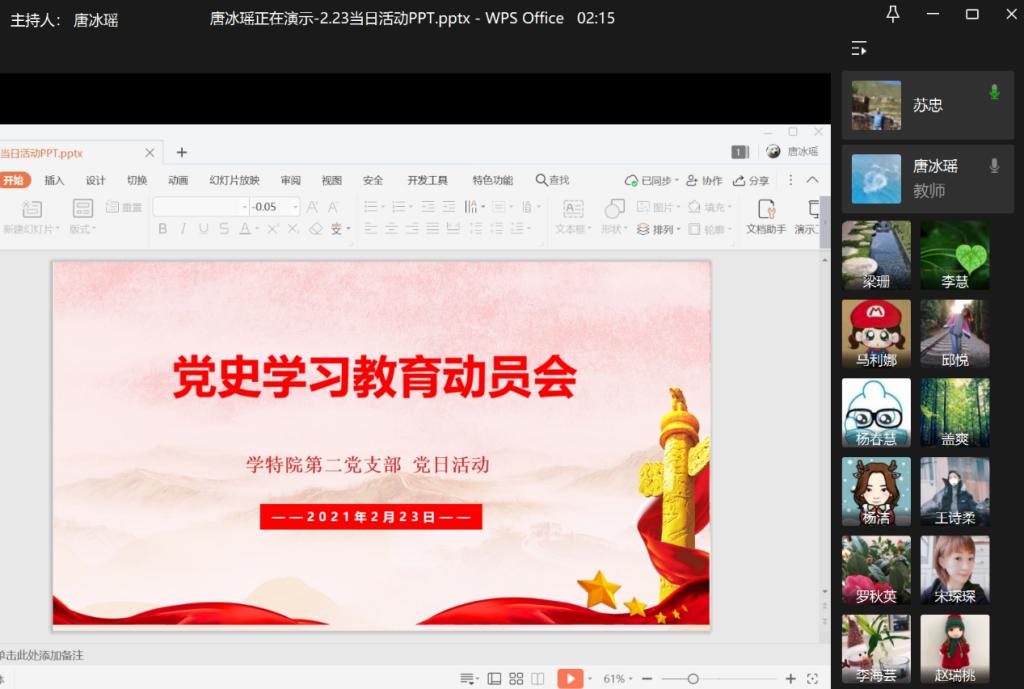 2021年2月23日上午10点,VSport体育第二党支部通过线上会议开展党史学习教育活动启动会。会议特别邀请学特公司党总支李海芸书记进行动员宣讲,支部全体党员教师准时参加。