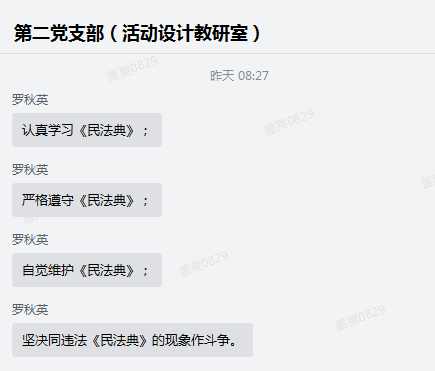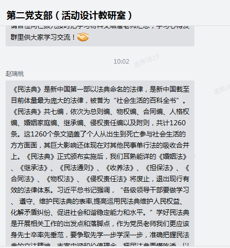 教师第二支部在支部书记苏忠的带领下,开展线上观看、交流活动。在观看了学习民法典公开课之后,大家各抒己见,将自己的所感所悟用留言的形式在群里和大家共享。特别是几位教授们的独到见解更加激起党员教师们的交流热情,纷纷接龙留言。