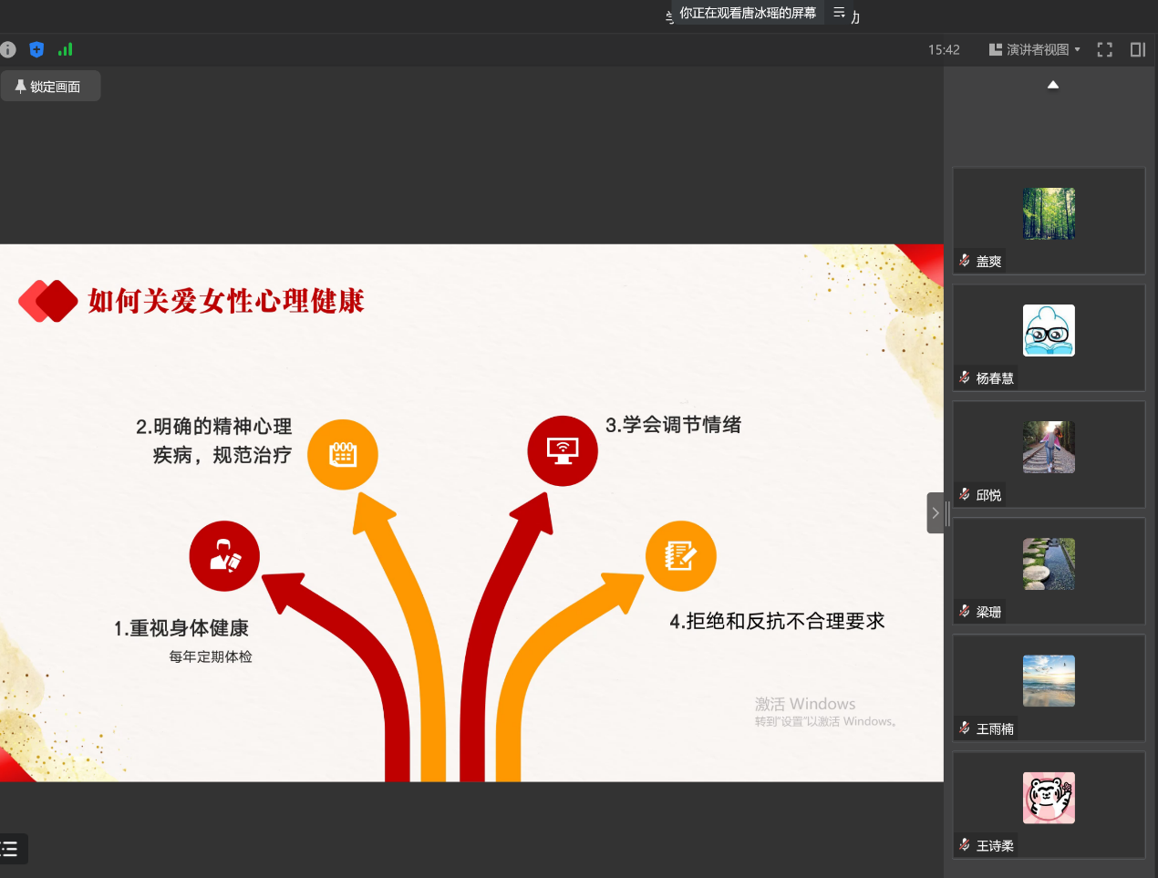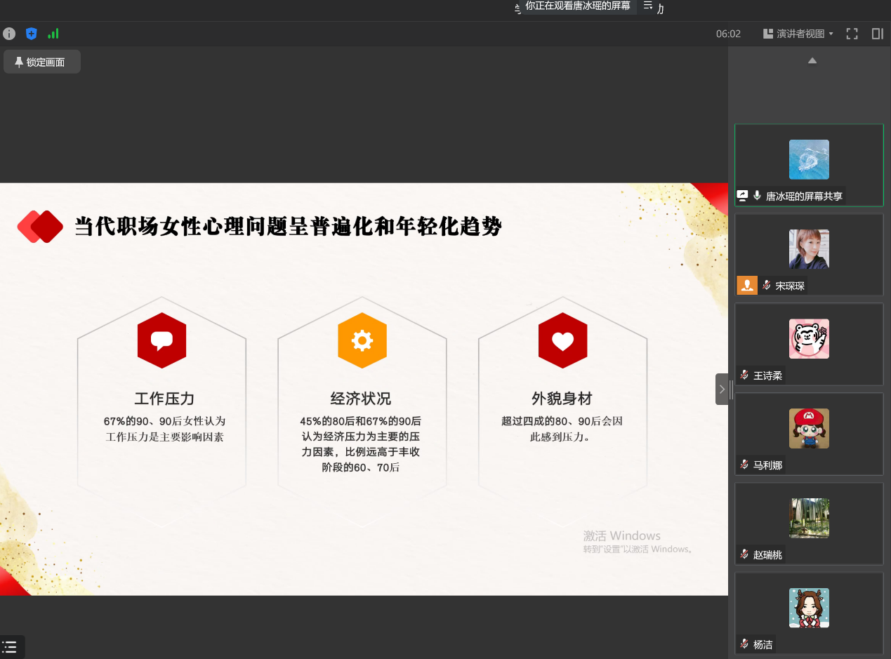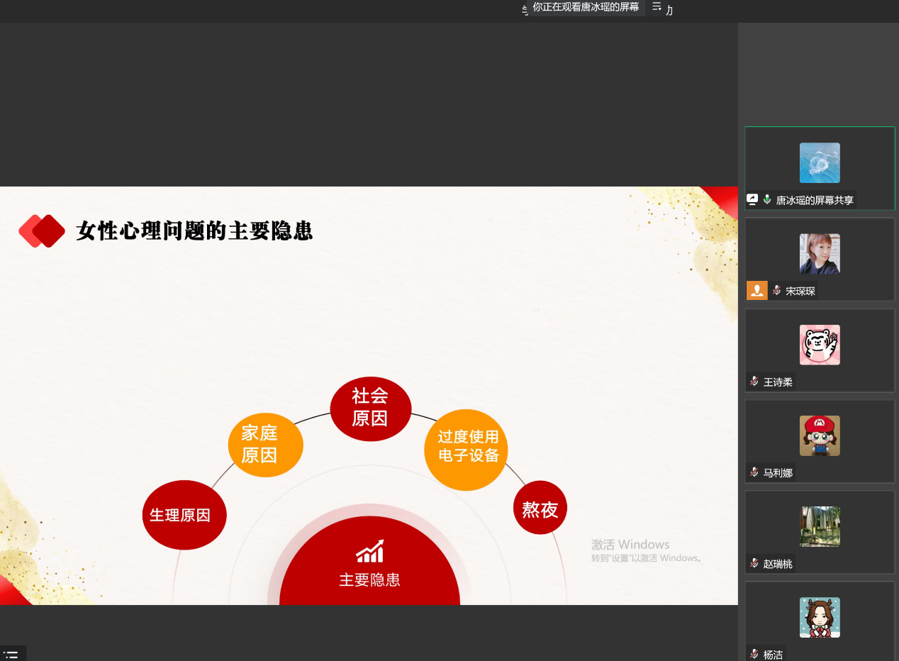 唐冰瑶分三个部分展开内容分享。首先,结合《中国职场女性心理健康绿皮书》中阐述工作、经济压力和外貌是女性心理问题最主要的三大来源,同时女性心理问题呈现普遍化和年轻化的现状。其次,从生理、家庭、社会及个体因素方面深入剖析造成女性心理健康隐患的原因。接着,唐冰瑶介绍了一些关爱自身心理健康的方法,如重视身体健康;学会调节情绪;拒绝和反抗不合理要求;敢于直面难题,不逃避。