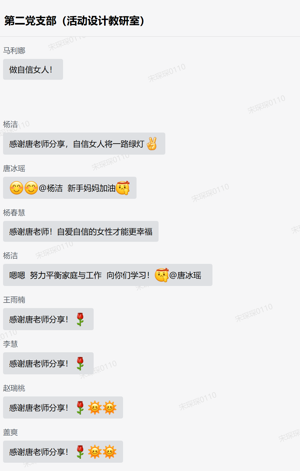最后,支部宣传委员宋琛琛做总结性发言,提出建议。一是,女性偏感性,应多表达常沟通,支委会加强对大家的关心;二是学会平衡工作与家庭的关系,劳逸结合。期望大家:自信为自己敞开一路绿灯。