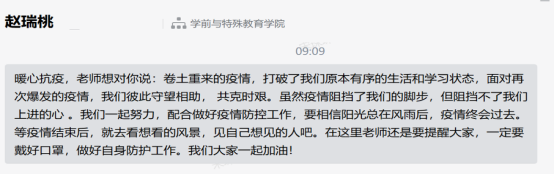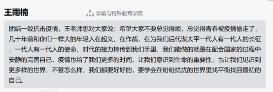 越是关键时刻,越要彰显党员本色,虽然不能像白衣天使和仁者医生那样战斗在一线,但党员教师用鼓励的话语,凝聚共克时艰的精神力量。在罗教授“不经暴风骤雨,哪知彩虹绚丽”的话语中体悟人生需经历困难与挑战;在李秀敏副经理“与其哀叹,不如珍惜,拥抱每一个春暖花开;心定而安,安则不乱,脚踏实地奔星辰大海”;盖爽老师“困难终将过去,胜利一定属于我们”;宋琛琛老师“隔离病毒,但不隔离爱,因为爱是桥梁;科学防控,携手共进,因为信心是抗击疫情最好的疫苗”等话语的鼓励下,充满着抗疫的信心。