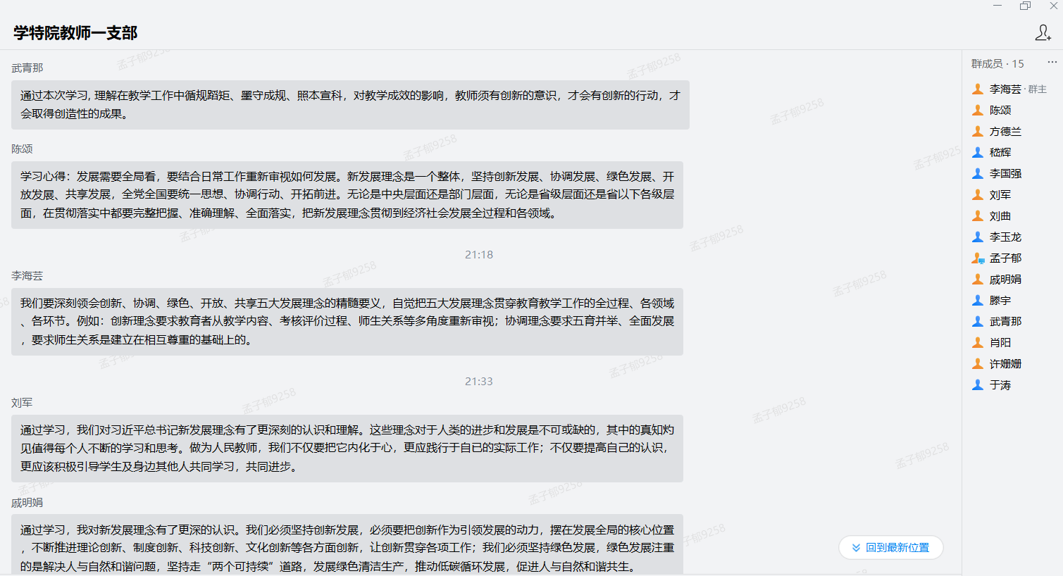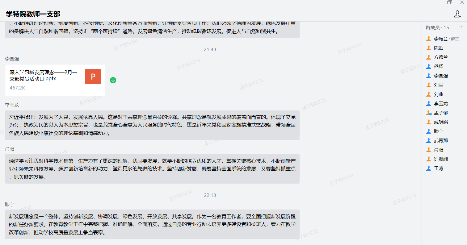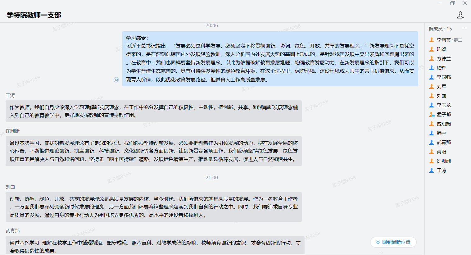 本次学习活动共两项。首先,李国强书记从新发展理念的科学内涵、历史沿革、当前存在问题及践行措施等方面向全体党员教师作了深刻解读,并分享了自己的见解。李书记强调,贯彻新发展理念既要全面把握,也要抓住重点,尤其要结合教育工作实际,进行深入理解和学习,并落实在自身工作上。接下来,全体党员教师在线上发表了自己的学习感言,讨论十分精彩热烈。