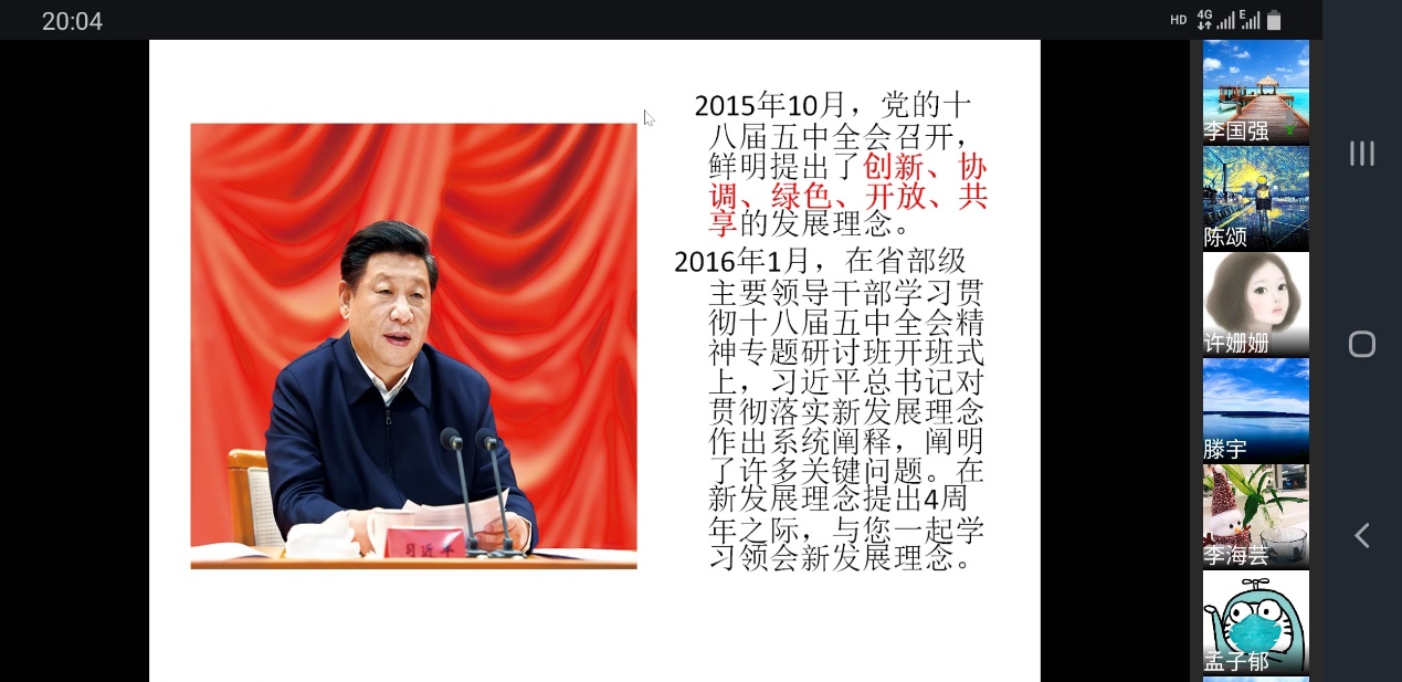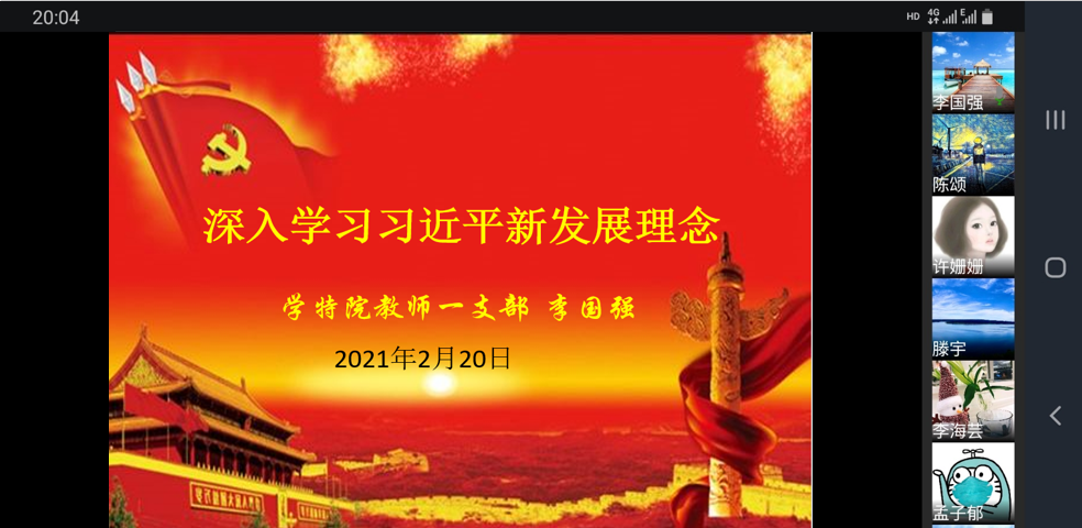 为深入学习贯彻新发展理念,引导支部党员教师以新发展理念指导自身工作,2021年2月20日晚8:00,学特院教师一支部举办了新发展理念线上学习活动。本次学习由一支部李国强书记主持并主讲,支部全体党员教师认真聆听,参与讨论。