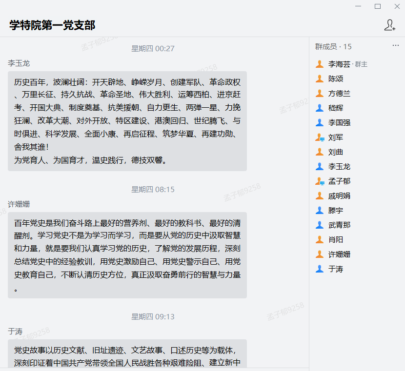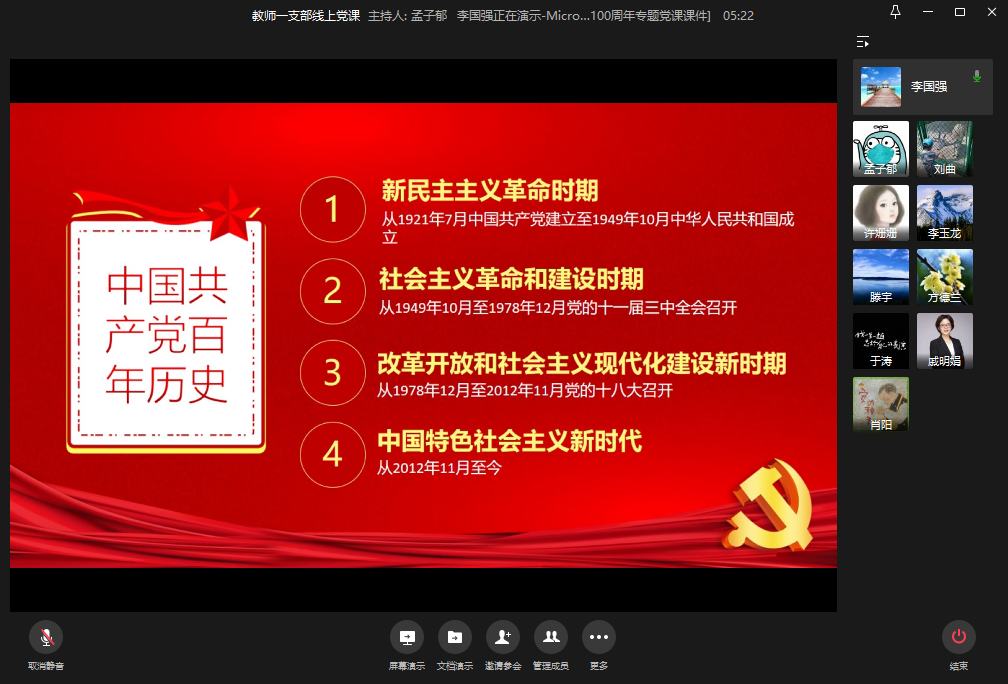 党课从“新民主主义革命时期”“社会主义革命和建设时期”“改革开放和社会主义现代化建设新时期”“中国特色社会主义新时代”为线索,回望了中国共产党的百年发展历程,总结了建党百年来的历史经验。李书记在党课上指出,我们要从党的百年光辉历史中坚定初心使命,做到政治过硬、本领高强,常怀忧党之心、为党之责、强党之志,以更加奋发有为的精神状态推进我国教育事业的高质量发展。云端党课结束后,党员教师在企业微信群里积极互动,发表此次党课学习的感想。