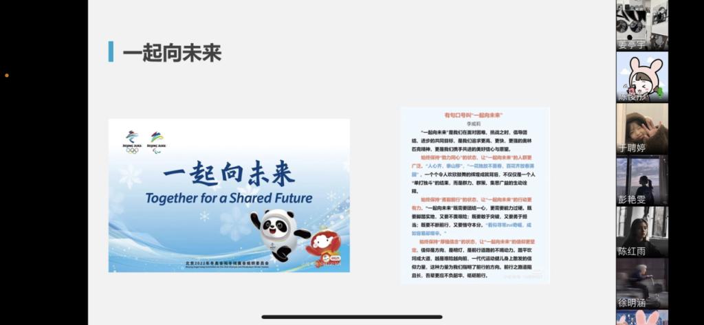此次主题教育活动采用线上班会模式,各班班主任、辅导员借助网络图片、短视频等形式带领同学们回顾了2022北京冬奥会的精彩瞬间,重温了赛场上的动人故事。通过分享武大靖、徐梦桃、谷爱凌、苏翊鸣等冬奥健儿面对挫折坚持不懈的努力和拼尽全力勇夺冠军的案例,引导同学们传承努力拼搏的奥运精神,感受梦想力量,努力转化为学习动力,战胜自我,创造属于自己的光明未来。会上,同学们纷纷抒发感慨,树立目标,为新学期的学习生活开了一个好头。