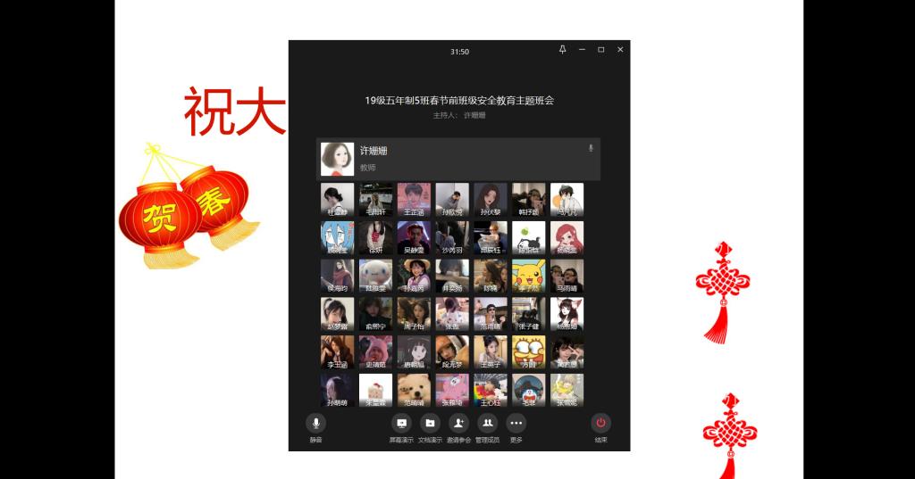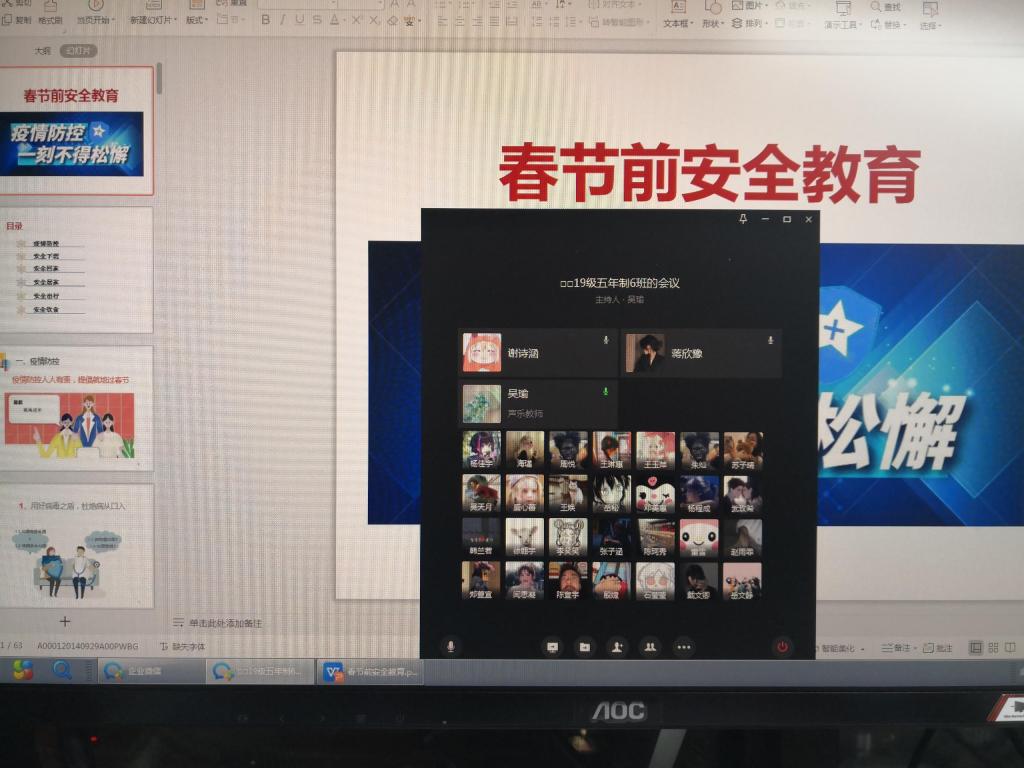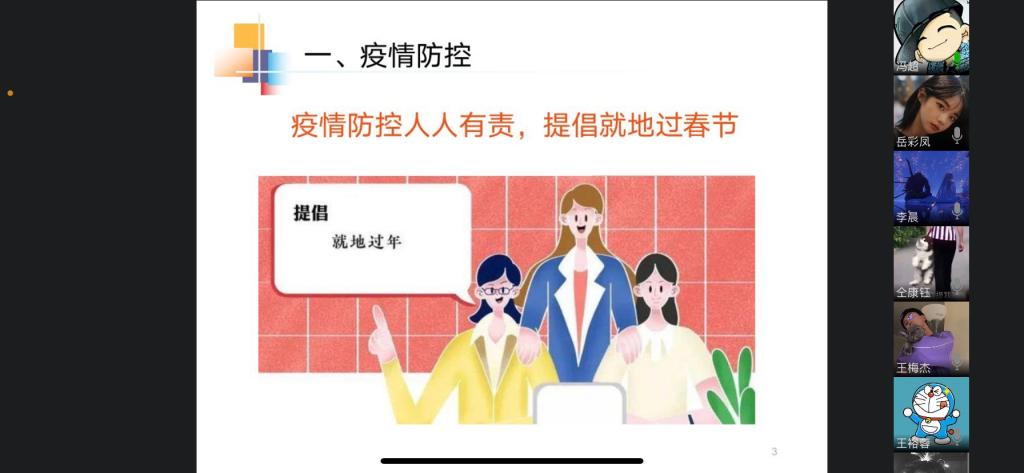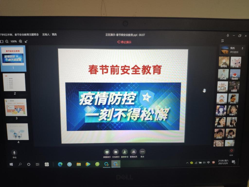 本次班会采取线上方式,主要围绕疫情防控、安全回家、安全居家等与同学们寒假生活息息相关的六大方面内容展开,通过反复讲、重点讲、结合实际讲,让同学们更加深刻地认识到安全的重要性,进一步掌握了科学实用的安全知识,强化了安全意识,增强了自我保护能力,从而为同学们度过一个“安全年”奠定坚实的基础。