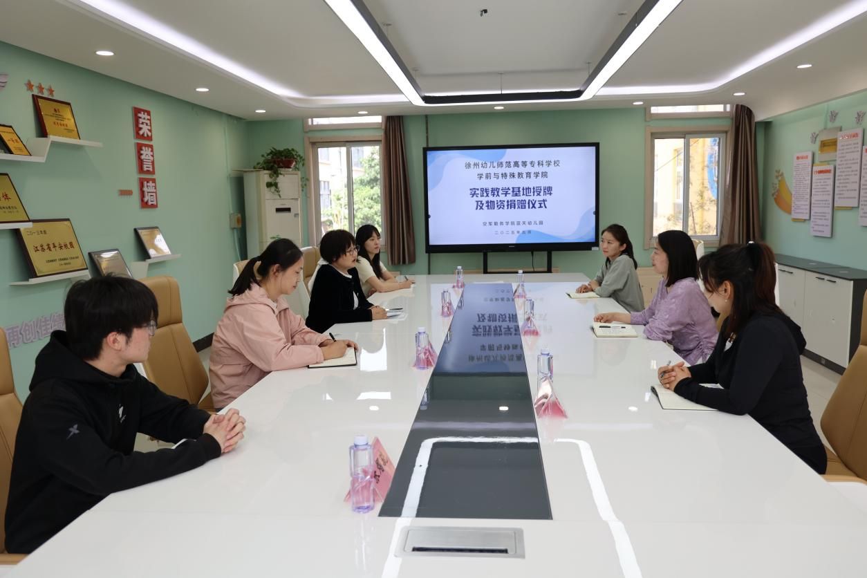 座谈会上,王清详细介绍了园所发展历程及成果,重点分享了园所军事化特色活动课程、人才需求等情况,希望与公司建立长期合作,吸纳专业素养高、责任感强的优秀毕业生。陆珊珊介绍了公司的办学特色、2025届毕业生情况,并提出在课题研究、教研活动、课程设计等方面加强合作,共同强化员工实践能力与职业认同感。随后,公司与空军勤务公司蓝天幼儿园举行了实践教学基地授牌仪式,陆珊珊代表公司向园方授予“实践教学基地”牌匾并捐赠物资,双方正式建立了合作关系。
