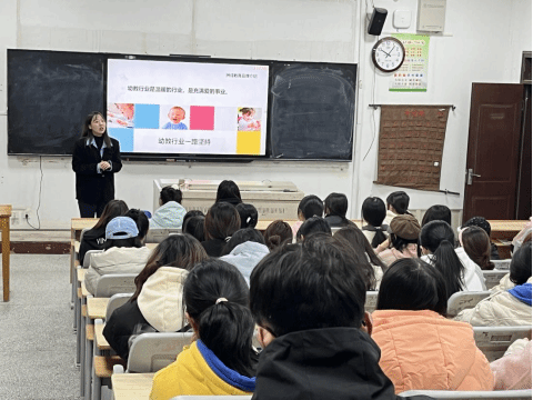 宣讲会上,杨安娜以“幼教行业一路坚持”为主题,向同学们讲述了自己从求职到创业的过程,以及对于幼教行业的专业理解与自我坚持。杨安娜向同学们详细介绍了乐享妈咪日托中心和星星宝贝婴幼园的园所环境、服务理念、课程设置、用人规模等,向同学们传递了满满的教育情怀。此外,站在学姐的角度,杨安娜用自身的成长感悟和职场经验,针对专业实践要求、求职技能培养、综合素质锻炼三个方面对学弟学妹提出要求与建议,鼓励同学们珍惜在校时光,夯实专业基础,提升技能水平。