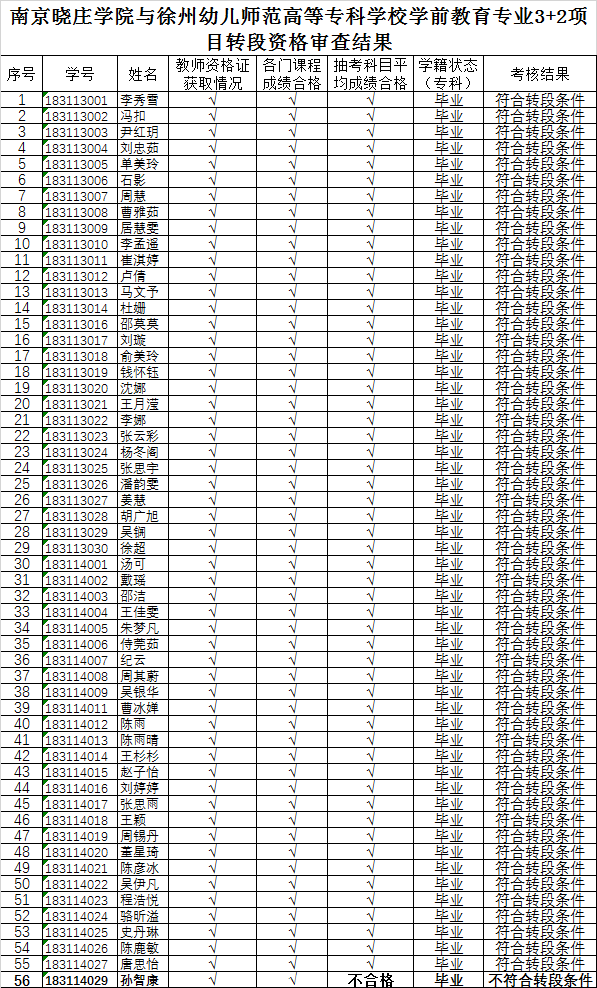 依据《南京晓庄公司高职与本科“3+2”分段培养项目转段升学考核工作办法(试行)》(南晓院【2019】20号)文件有关规定,经员工本人申请,VSport体育资格审查,教务处复查等程序,拟同意公司2018级学前教育专业“3+2”合作培养员工李秀雪等55位同学转段申请,现将名单予以公示,公示时间为2021年6月15日至2021年6月19日。