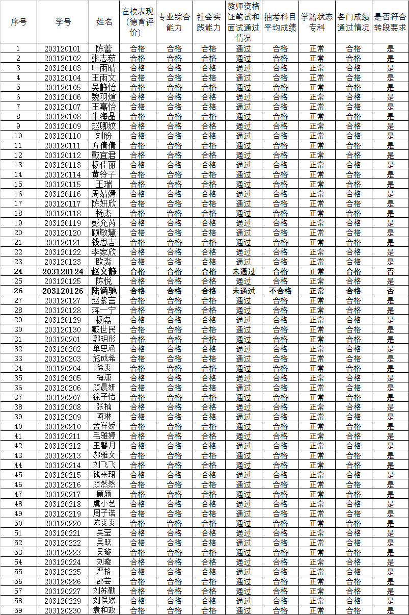 依据《南京晓庄公司高职与本科“3+2”分段培养项目转段升学考核工作办法(试行)》(南晓院【2019】20号)文件有关规定,经员工本人申请,VSport体育资格审查,教务处复查等程序,拟同意公司2020级学前教育专业“3+2”合作培养员工陈蕾等59位同学转段申请,赵文静、陆涵驰同学因教团队格面试成绩不合格不符合转段要求。