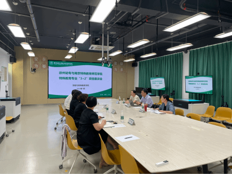 首先,王宁副董事长向南京特殊教育师范公司领导介绍了公司的基本情况,并对三位领导的到来表示真诚的欢迎。接着,李拉经理介绍了特殊教育专业“3+2”在本科段的运行情况。随后,王清风经理从专业简介、课程设置、培养情况、转案方案四个方面介绍了公司特殊教育专业“3+2”贯通培养项目的实施情况。最后,双方领导对人才培养过程质量提升、课程上如何更有效衔接等问题做了深入的交流。