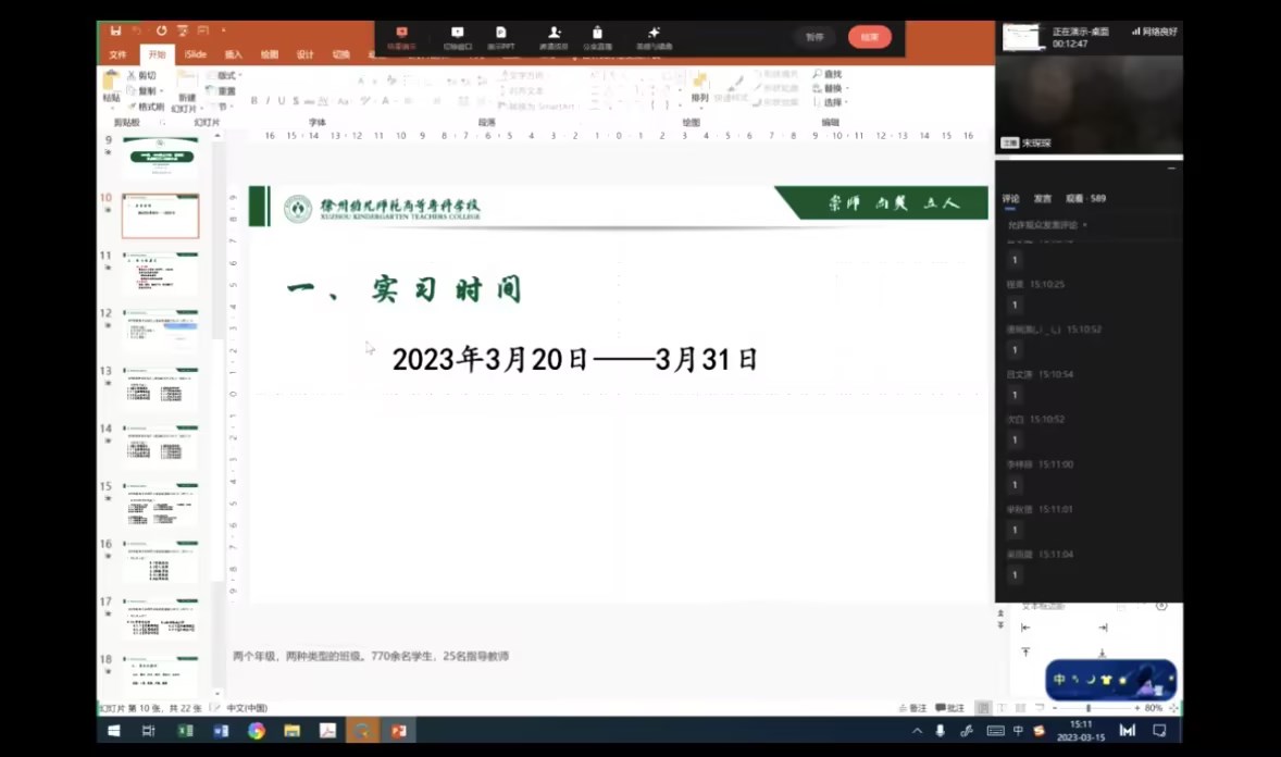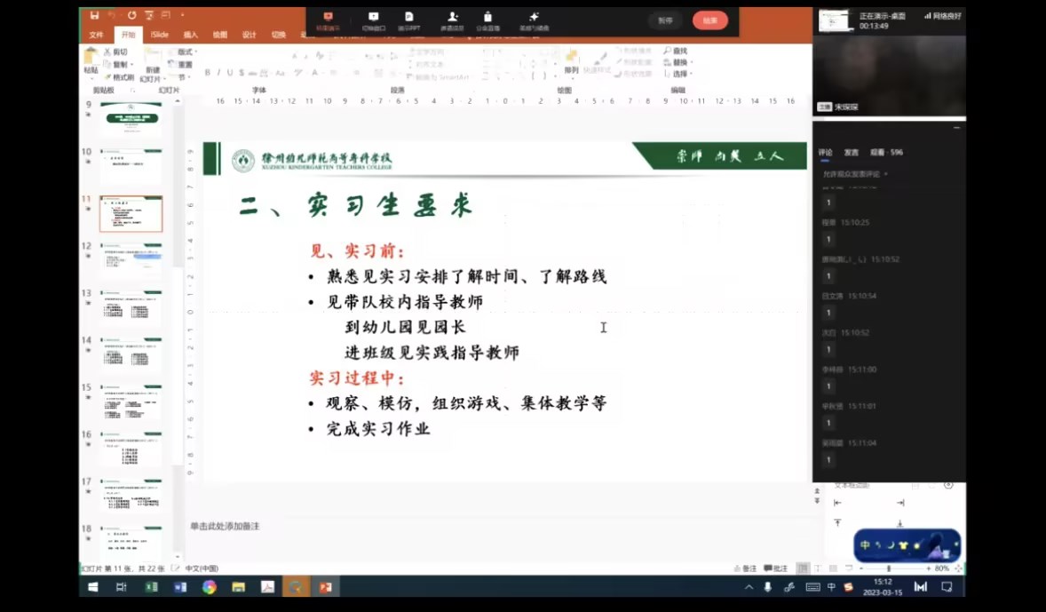 2023年3月15日下午,公司线上召开学前教育专业2019级、2020级五年制、西藏班师生实习动员大会。大会由副经理宋琛琛主讲,学前教育专业2019级、2020级五年制、西藏班全体员工、班主任和公司指导教师参加。
