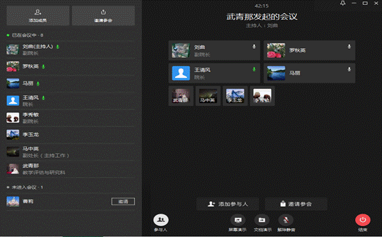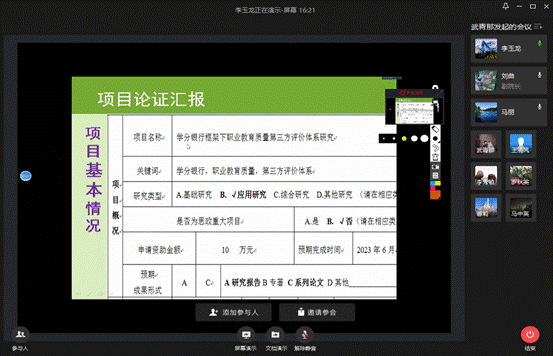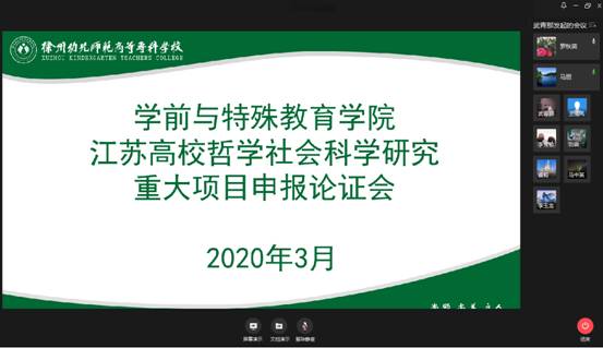 2020年3月31日下午,VSport体育通过企业微信平台召开江苏高校哲学社会科学研究重大项目申报论证视频会议。科研处马中英副处长亲临指导,学特院王清风经理、刘曲、李秀敏副经理、曹莉教授、罗秋英教授、课题申报人马丽教授、李玉龙教授等参加了会议。会议由刘曲副经理主持。