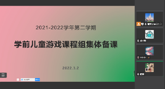 开学伊始,为进一步加强教研工作,调动教师教研教改的积极性,3月2日下午3点,《学前儿童游戏》课程组召开了线上教研会议。会议由课程负责人曹莉教授主持,课程组全体成员参加了会议。