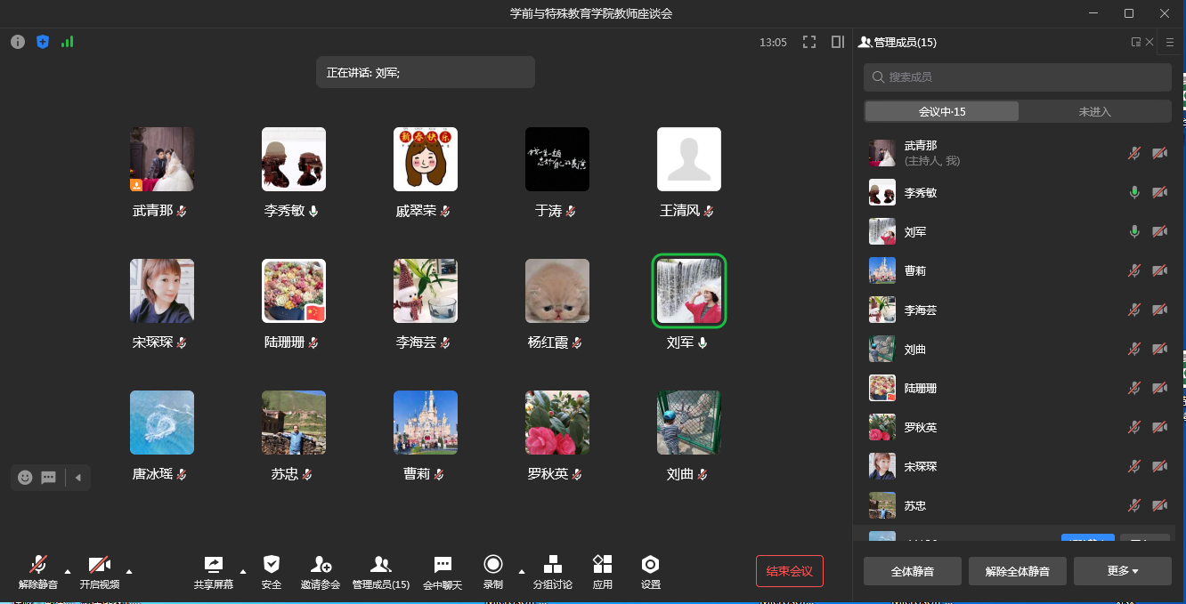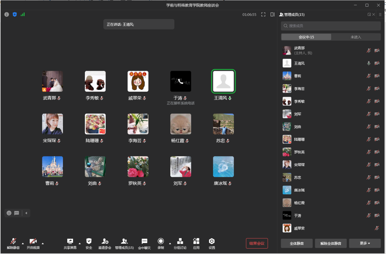 为全面了解公司本学期教学过程中的实际情况,促进教学改革、完善教学管理,4月29日下午,公司召开线上期中教师座谈会,会议由李秀敏副经理主持,王清风经理、李海芸书记及督导组老师、各教研室主任等参加了此次会议。