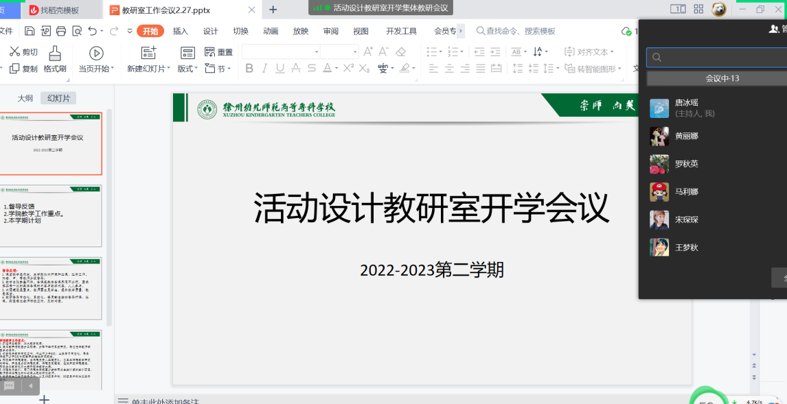 2月27日下午,公司活动设计教研室开展新学期线上教研会议。会议由教研室负责人唐冰瑶主持,学前儿童健康教育、学前儿童艺术教育、学前儿童语言教育、早教专业课程组共计15位老师参加。