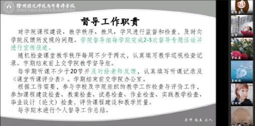 李秀敏副经理带领大家一起学习了督导员工作职责。王清风经理强调,全体督导组成员要根据职责要求做好听课、巡课,工作过程中更重要的是引导督促青年教师发展,发现问题及时反馈。