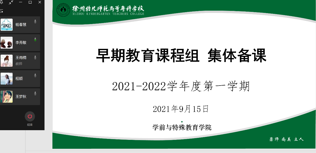 9月15日下午,学特院早期教育课程组开展了线上集体备课活动,此次活动由课程负责人王雨楠老师主持召开,早期教育专业课程任课教师李秀敏副经理、程颖老师、杨春慧老师、王梦秋老师参与。