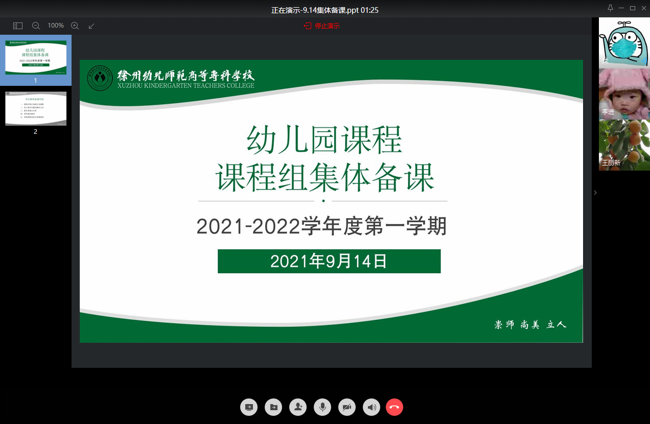 9月14日下午,学特院活动设计教研室《幼儿园课程》课程组开展了新学期线上集体研讨会。此次会议由课程负责人孟子郁老师主持召开,课程任课教师王丽新教授、李进园长参与。