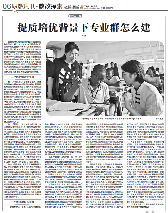12月7日,公司副经理刘曲老师在《中国教育报》职教周刊上发表文章《提质培优背景下专业群怎么建》。文章论述了专业群建设的三个思路:发挥优势,科学组建专业群;顶层设计,整体统筹各项资源;团队保障,确保专业群可持续发展。同时,重点阐释了专业群建设的五个路径:聚焦能力,实施“1+X”证书制度;产教融合,建立“政-行-校-企”四方联动协同育人机制;对接岗位,构建“平台+模块+方向”课程体系;课堂革命,纵深推进专业群教材和教法改革;专兼结合,打造国内一流的教学创新团队。
