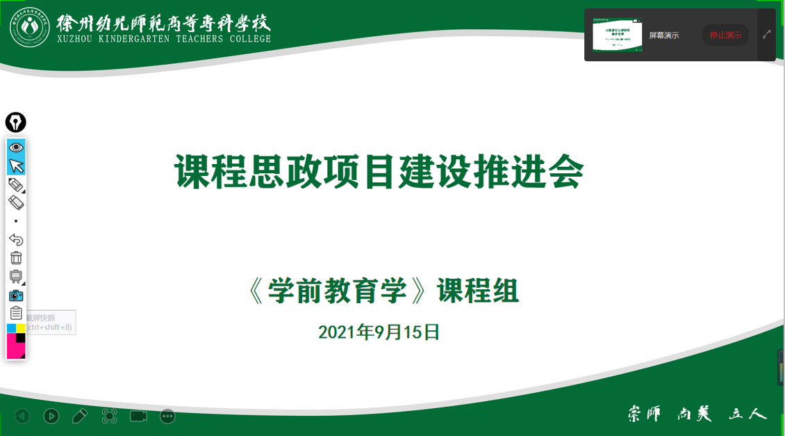 9月15日下午,学特院儿童发展与教育教研室《学前教育学》课程组开展了课程思政项目建设推进会。此次会议由课程负责人苏忠教授主持召开,课程任课教师王宁处长、栾文娣副处长、于涛老师、嵇辉老师参与。