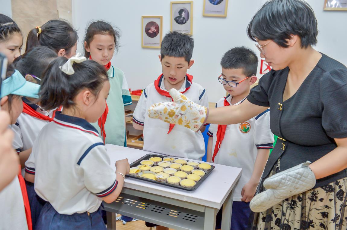 在“美食DIY”活动中,同学们品尝着自己制作的蛋糕喜笑颜开。