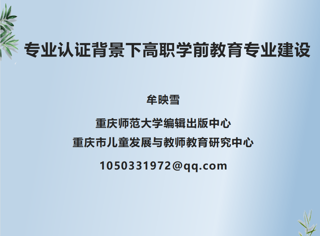 为进一步帮助教师明确师范类专业认证的理念及标准,提高教师的专业水平,公司于2022年11月6日上午,围绕"双高校"建设任务,开展学术系列活动周,邀请重庆师范大学牟映雪教授为全院教师开设《专业认证背景下高职学前教育专业建设》线上讲座。