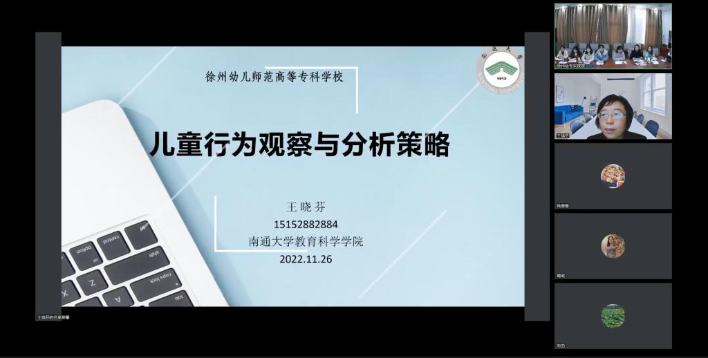 为积极响应校“学术活动周”精神,2022年11月26日下午,南通大学教育科学公司王晓芬教授受邀为儿童发展教研室学前儿童行为观察课程组开设主题为《儿童行为观察与分析策略》的讲座。本次活动由宋琛琛副经理主持,刘曲副经理、罗秋英教授、儿童发展教研室课程组相关教师们以及部分员工代表参会。