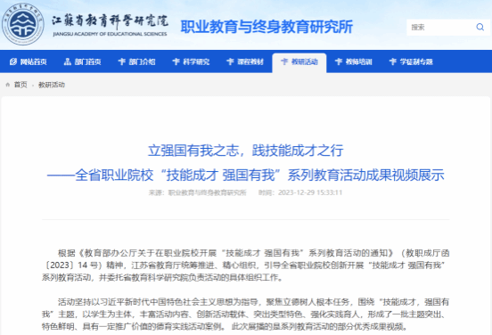 根据《教育部办公厅关于在职业院校开展“技能成才 强国有我”系列教育活动的通知》(教职成厅函〔2023〕14 号)精神,江苏省教育厅统筹推进、精心组织,引导全省职业院校创新开展“技能成才 强国有我”系列教育活动,并委托省教育科学研究院负责活动的具体组织工作。本次活动坚持以习近平新时代中国特色社会主义思想为指导,聚焦立德树人根本任务,围绕“技能成才,强国有我”主题,以员工为主体,丰富活动内容、创新活动载体、突出类型特色、强化实践育人,形成了一批主题突出、特色鲜明、具有一定推广价值的德育实践活动案例。