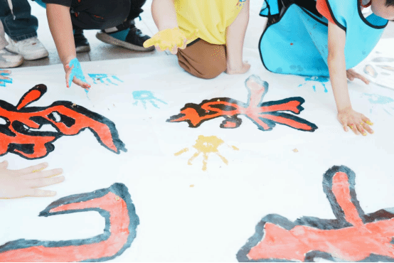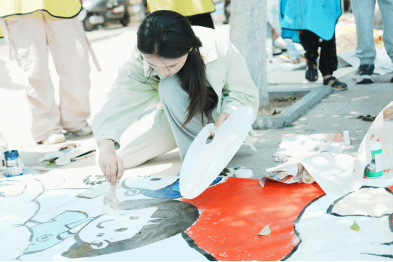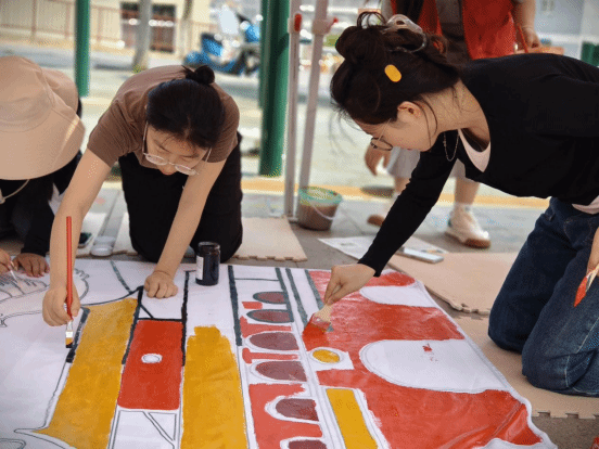 纳斯卡巨画由四块画布组成,各组成员带领社区小朋友们在分配好的绘画区域内开始紧锣密鼓的绘制。她们手持画笔、颜料,或立、或蹲、或俯,分工明确、各司其职,依循图案的边框与线条,将色彩铺满每一个角落,一点点在画布上充实进“天安门广场”、“和平的白鸽”和“绚烂的向日葵”等图案,尽情发挥着创造力和艺术才能。经过两个多小时的共同努力,每组都顺利完成了创作。当画布拼接在一起时,“童心向党 筑梦未来”的巨幅画作在所有人的欢呼声中徐徐展开,大家不仅领略到了纳斯卡线条的创作之美,更是油然而生起满满的自豪感与成就感,以及强烈的归属感和凝聚力。