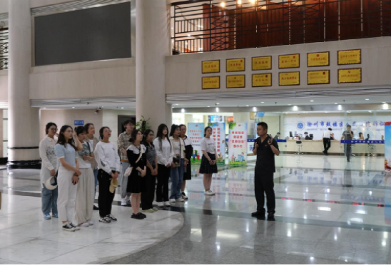 师生们在少年家事审判庭庭长王文庆的带领下,依次参观了诉讼服务中心、少年家事联合维权中心、婚姻家庭公司、心理疏导室、家事法庭、少年法庭、执行服务中心等地。