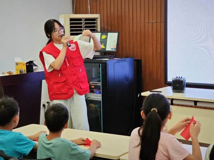 随后,在志愿者的带领下,小朋友们动手制作立体五角星。他们纷纷拿起折纸、画笔和剪刀,跟随着老师的动作,认真学习,小心折叠,一颗颗独一无二的五角星被制作出来。用自己认真制作的五角星来致敬我们伟大的英雄,传递着对祖国的热爱。