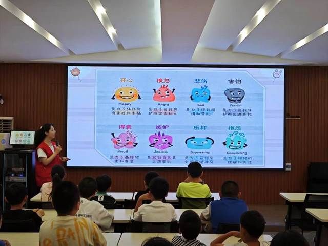 课堂上,志愿者老师首先向小朋友们介绍了如何理解情绪,用生动的语言与孩子交流,教会他们承认情绪的同时,理解自己的情绪,在以后的经历中区分自己不同的情绪体验,提升他们语言和自我表达的能力。小朋友们听得聚精会神,就像是拥有了一把打开心灵大门的钥匙,知晓了每扇大门后的所藏何物,丰富了心理健康知识储备。